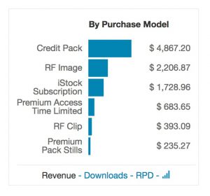 Here follows a screenshot which displays the various RPD values. This screenshot sample displays that video sales are much larger than photo sales, or that sales on Getty are the highest priced: