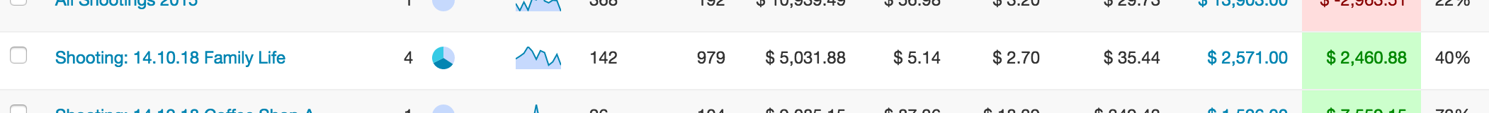 In this example, you see how the photoshooting “Family Life” has a positive return on investment. It cost $2,571 to produce and has already created $5,031.88 in revenue, resulting in profit of $2,460.88.