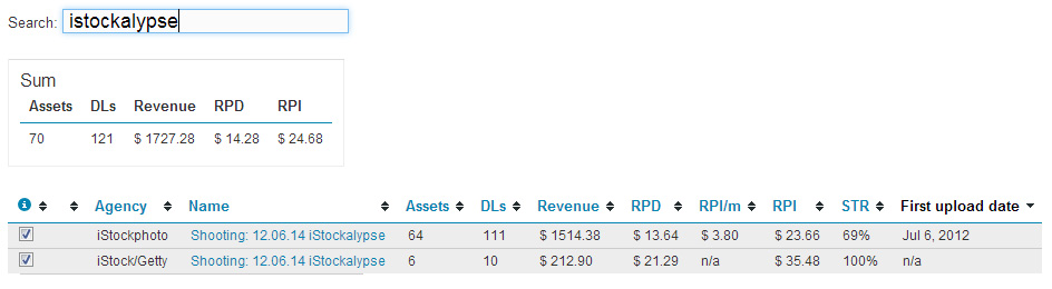 For example, my iStockalypse Berlin 2012 shoot has collected $1514 on iStockphoto and $212 on Getty Images. By checking the checkboxes on the collection’s left, Stock Performer will automatically sum up the values for you! Here you have an example: